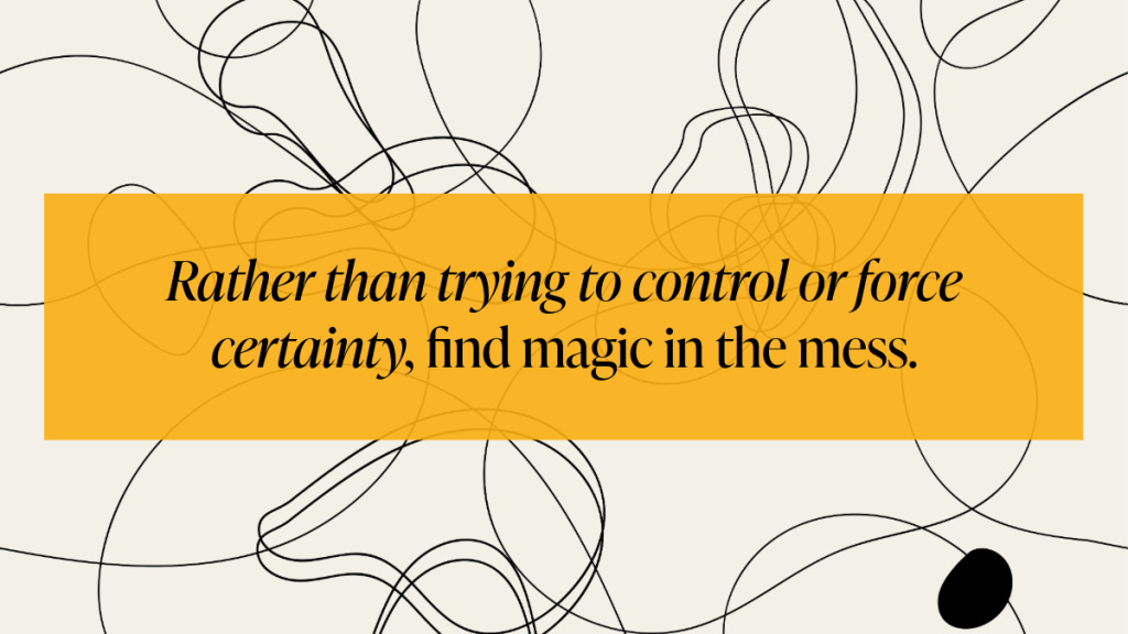 Embrace perspective and hold space for curiosity when life throws you a “challenge.” Rather than trying to control or force certainty, find magic in the mess. Shifting your perspective may just unveil the beauty even in the most challenging times.